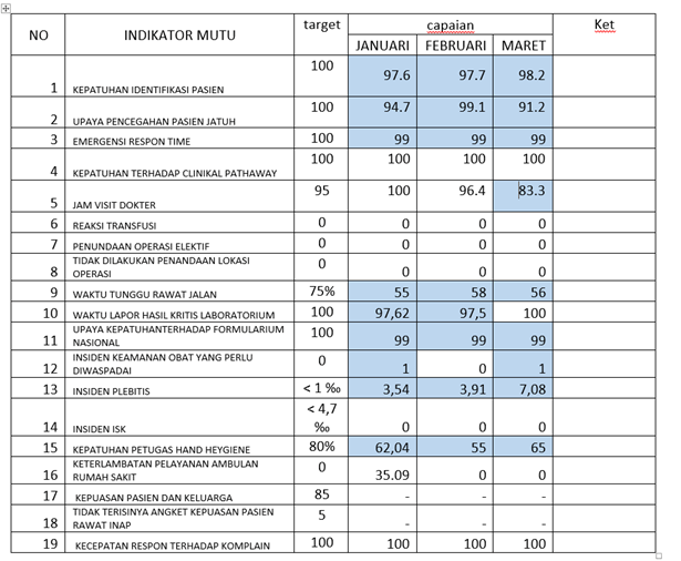 Berdasar data capaian diatas dapat diketahui bahwa capain indicator mutu ada bebrapa yang sudah mencapai target diantaranya, kepatuhan terhadap CP,reaksi tranfusi,penundaan operasi elektif,tidak dilakukan penandaan lokasi operasi,waktu lapor nilai kritis .insiden ISK,insiden phlebitis bulan agustus sepytember,keterlambatan pelayanan ambulance,serta kecepatan respon terhadap complain.