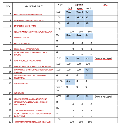 Indicator mutu yang belum tercapai ada delapan indicator mutu diantaranya adalah : kepatuhan identifikasi pasien, upaya pencehagan pasien jatuh emergensi respon time,waktu tunggu rawat jalan, insiden keamanan obat yang perlu diwaspadai pada bulan September,kepatuhan terhadap fornas di bulan September, insiden phlebitis pada bulan juli ke[atuhan petugas terhadap hand hiygin.
